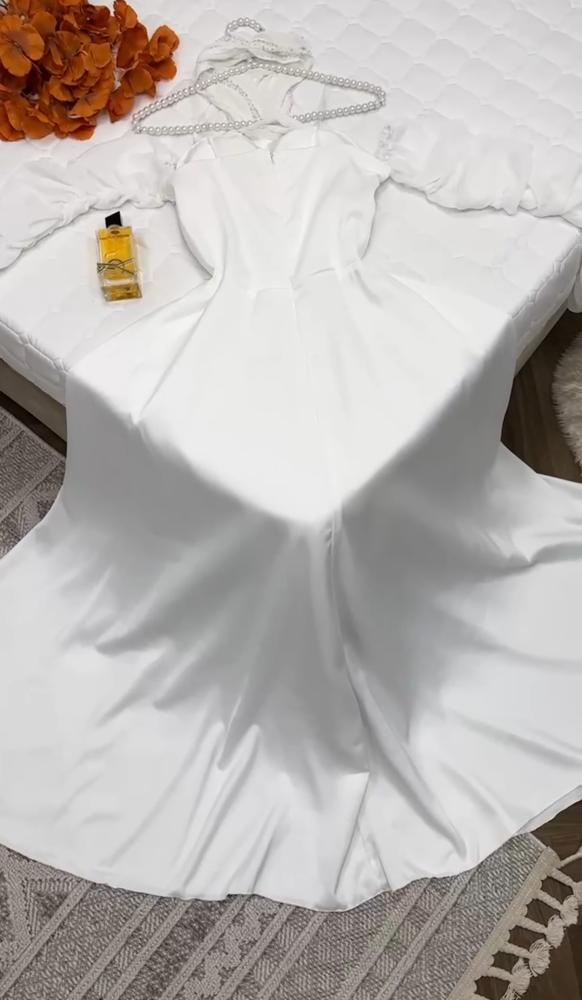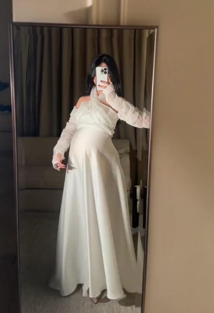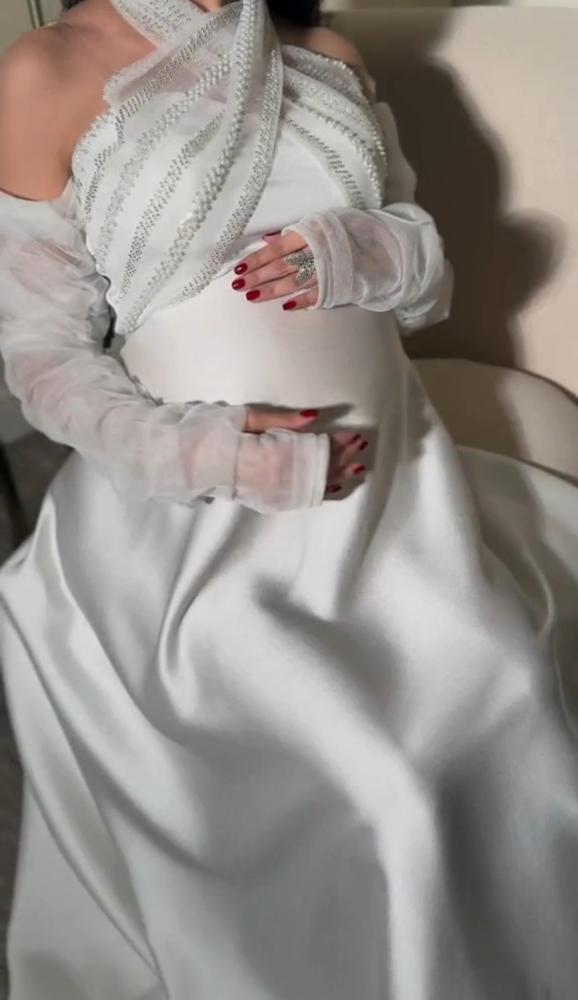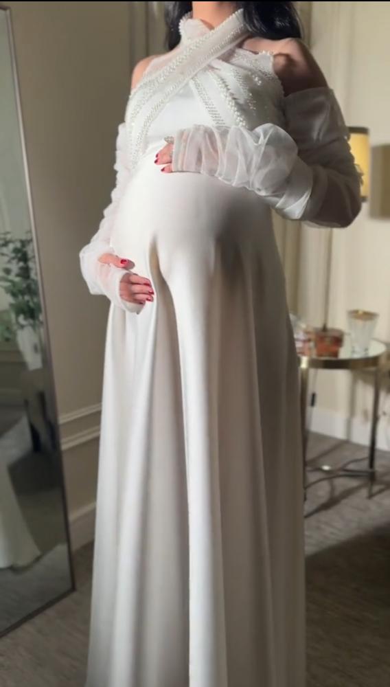 قدّمت لكِ فستان أبيض أنيق، مثالي للحوامل، يجسد الأنوثة والراحة في كل تفاصيله. تصميمه يتميز بأكتاف مكشوفة مع حزام مزين بالخرز، مما يضفي لمسة من الفخامة.