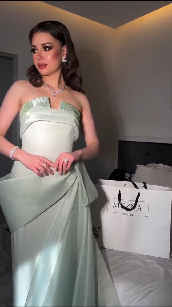هذي الفستان الأخضر الفاتح، تصميمه أنيق وراقي، مثالي للمناسبات الخاصة والسهرات. القصة strapless تضيف لمسة من الجاذبية، مع تفاصيل اللمعة اللي تبرز جمال التصميم.