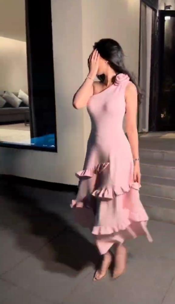 فستان وردي فاتح أنيق، يجسد الأنوثة والجرأة بتصميمه المميز. الفستان بأكمام واحدة مع تفاصيل من الكشكش على الحواف، وزهرة جميلة تزين الكتف، مما يضيف لمسة ساحرة وجذابة.