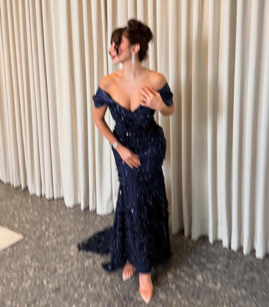 فستان سهره فخم بلونه الأزرق ، مطرّز بترتر لامع يلفت الأنظار، بقصّة ضيّقة تبرز الخصر مع فتحة صدر جريئة تعطيه لمسة أنوثة وأناقة ملكيّة. ✨