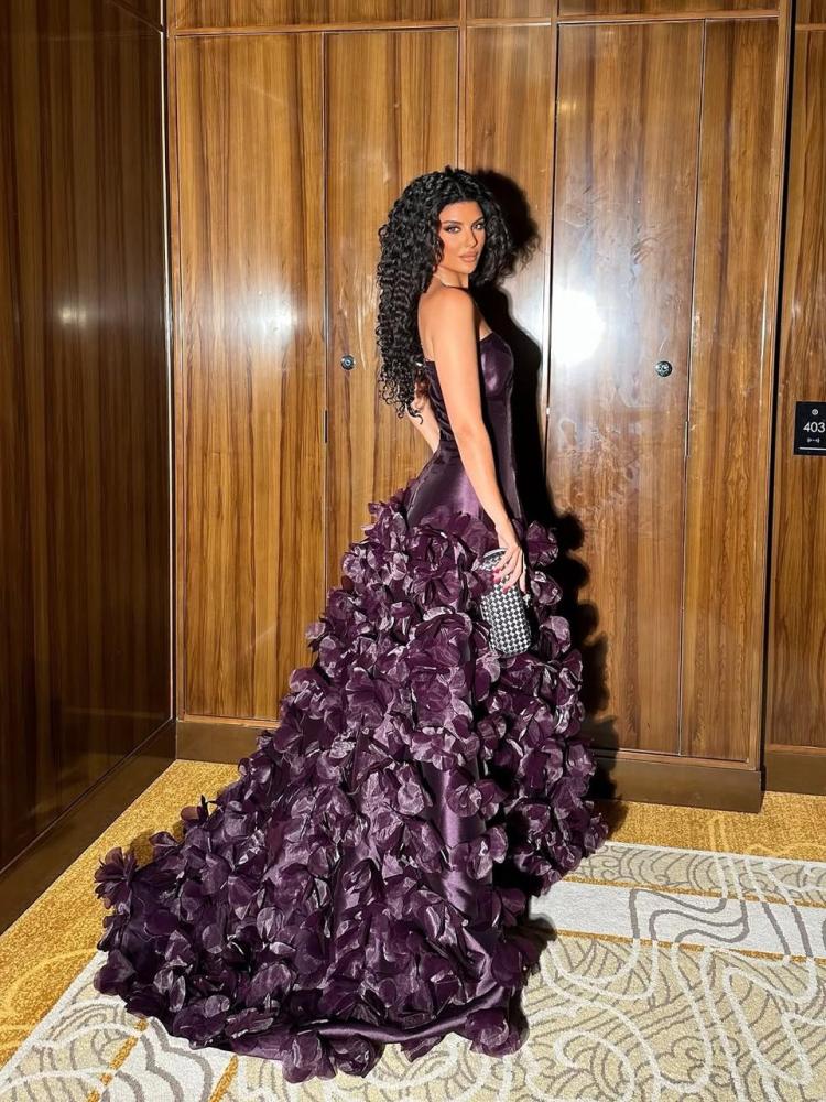 فستان سهرة ملكي بلون بنفسجي غامق، بتصميم أوف شولدر وقماش فاخر مزين بوردات ثلاثية الأبعاد تعطيه فخامة وأناقة تخطف الأنظار. ✨💜