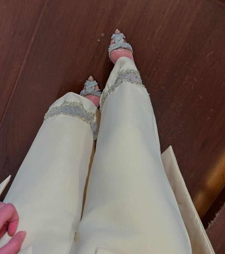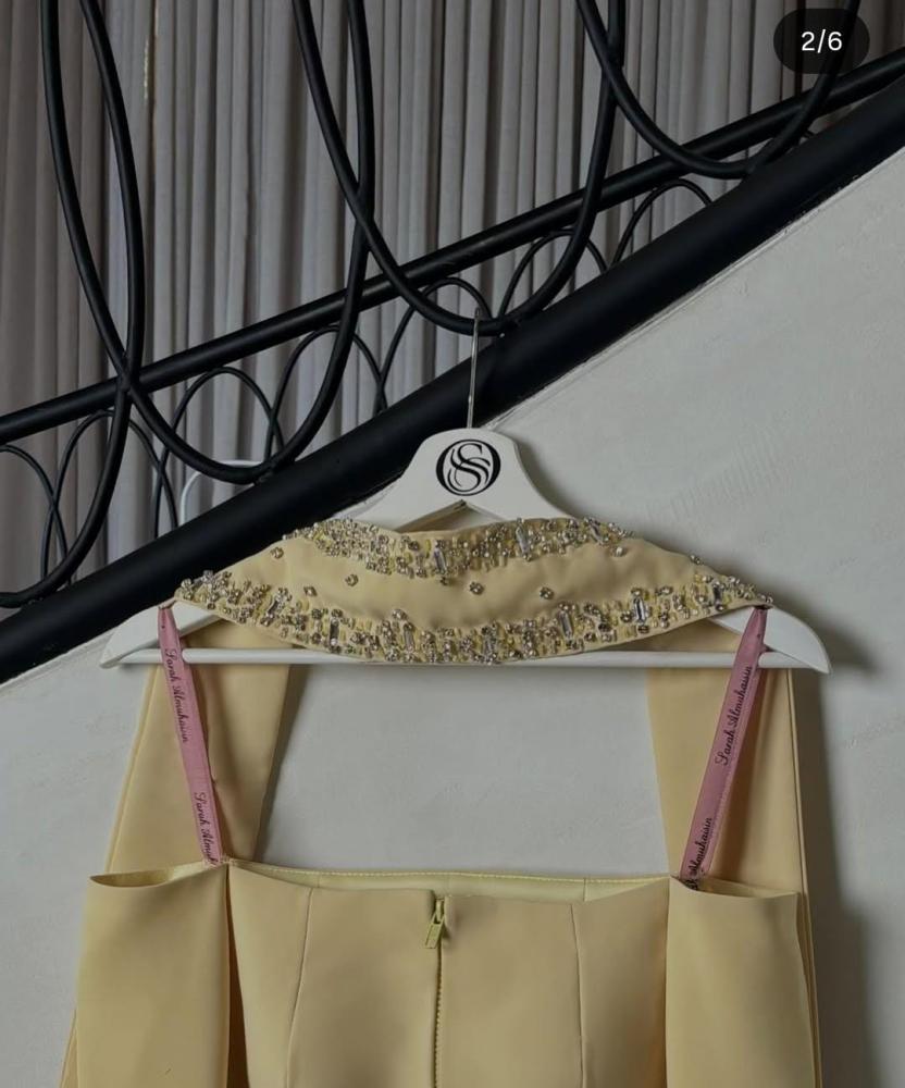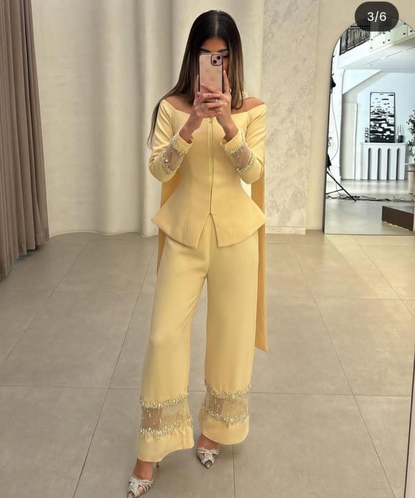 قدّمت لكِ طقم أنيق بلون أصفر فاتح، يجسد الأنوثة والعصرية. يتكون الطقم من بلوزة بأكتاف مكشوفة مع تفاصيل مزينة بالخرز، مما يضيف لمسة من الفخامة والجاذبية.