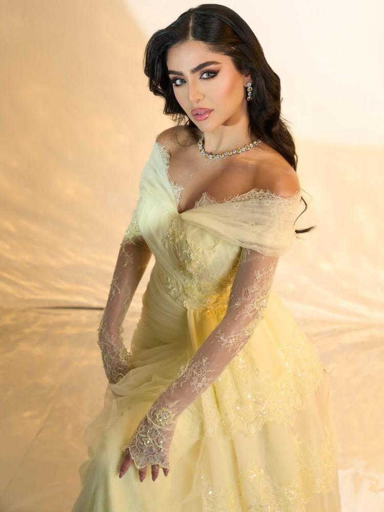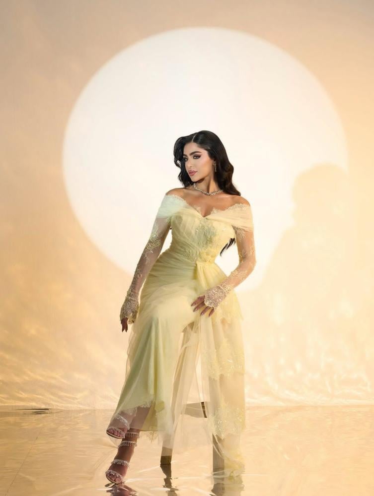 فستان سهرة فخم بلون أصفر فاتح، تصميم أوف شولدر مع أكمام دانتيل شفافة وتفاصيل تطريز راقية، يعطي إطلالة ملكية تناسب المناسبات المميزة.