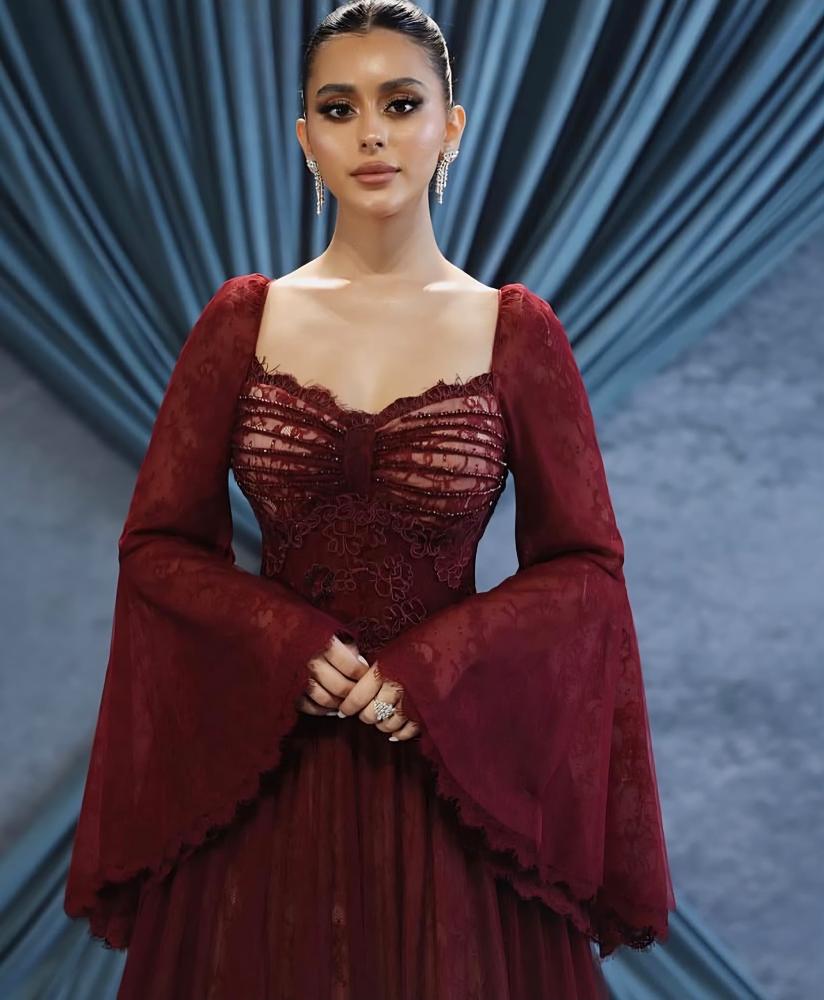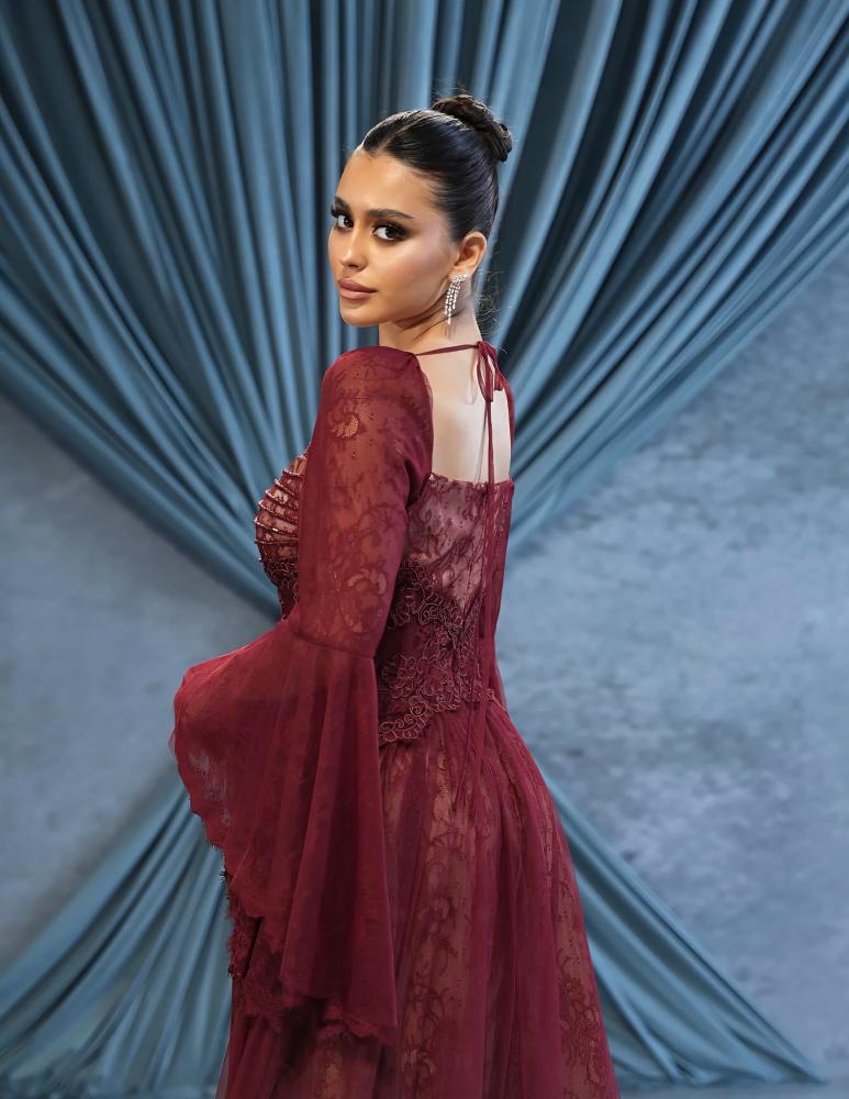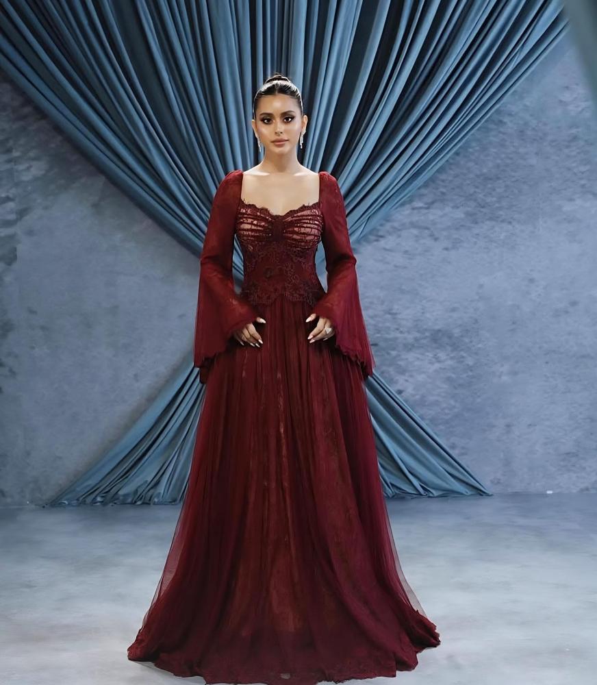 فستان فخم بلون عنّابي راقٍ، بتصميم أنثوي راقي وأكمام واسعة تضيف لمسة فخامة، مثالي للمناسبات اللي تبينين فيها بذوقك الراقي وجمالك اللافت✨
