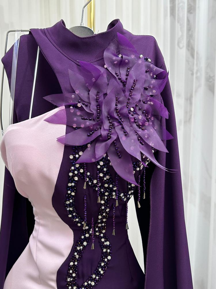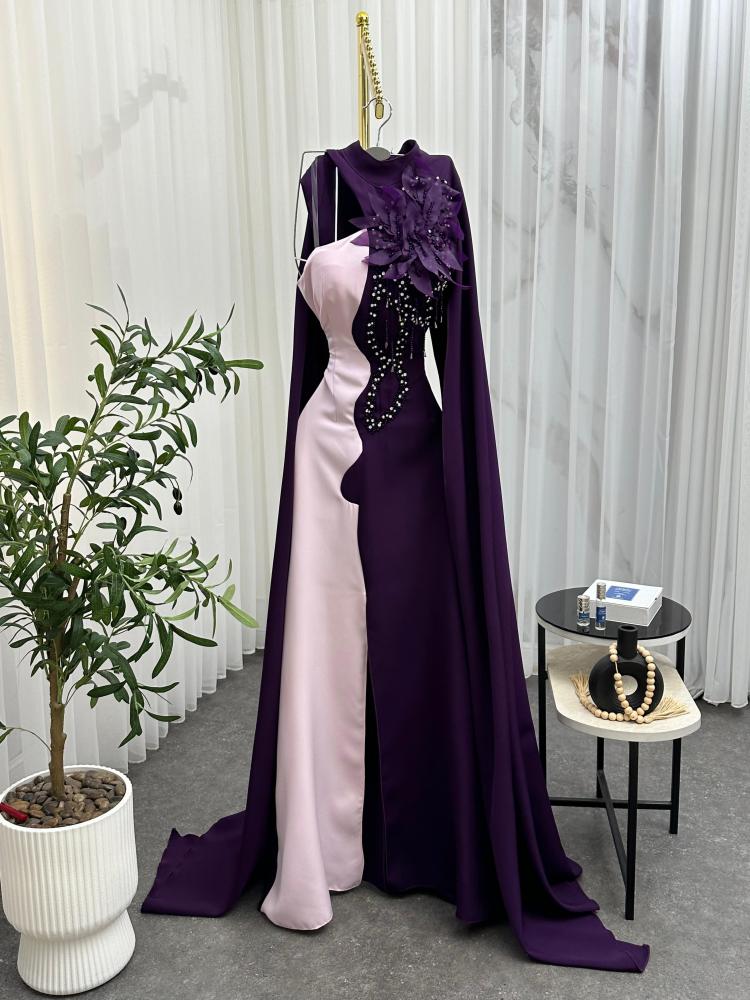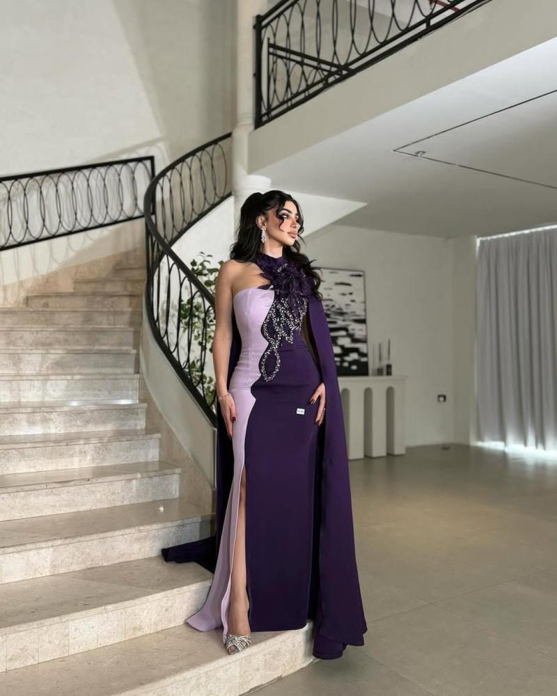 هلا وغلا! قدّمت لكِ فستان ساحر يجمع بين الأناقة والفخامة، بلونين رائعين: البنفسجي الفاتح والغامق. تصميمه الكتف الواحد مع عباءة جانبية يضيف لمسة من الجاذبية والرقي.