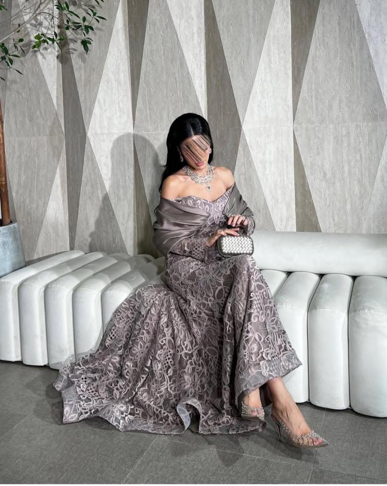 هلا وغلا! قدّمت لكِ فستان فخم بلون رمادي جذاب، يجمع بين الأناقة والأنوثة. تصميمه بأكتاف مكشوفة مع أكمام طويلة، مما يضفي لمسة من السحر والرقي.