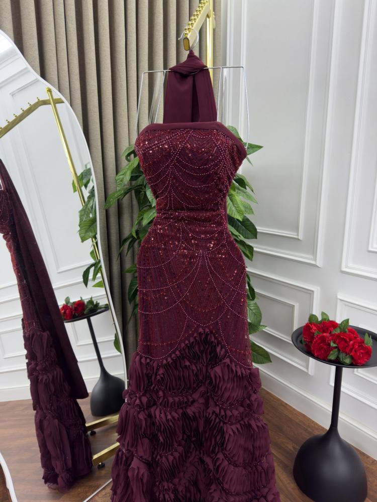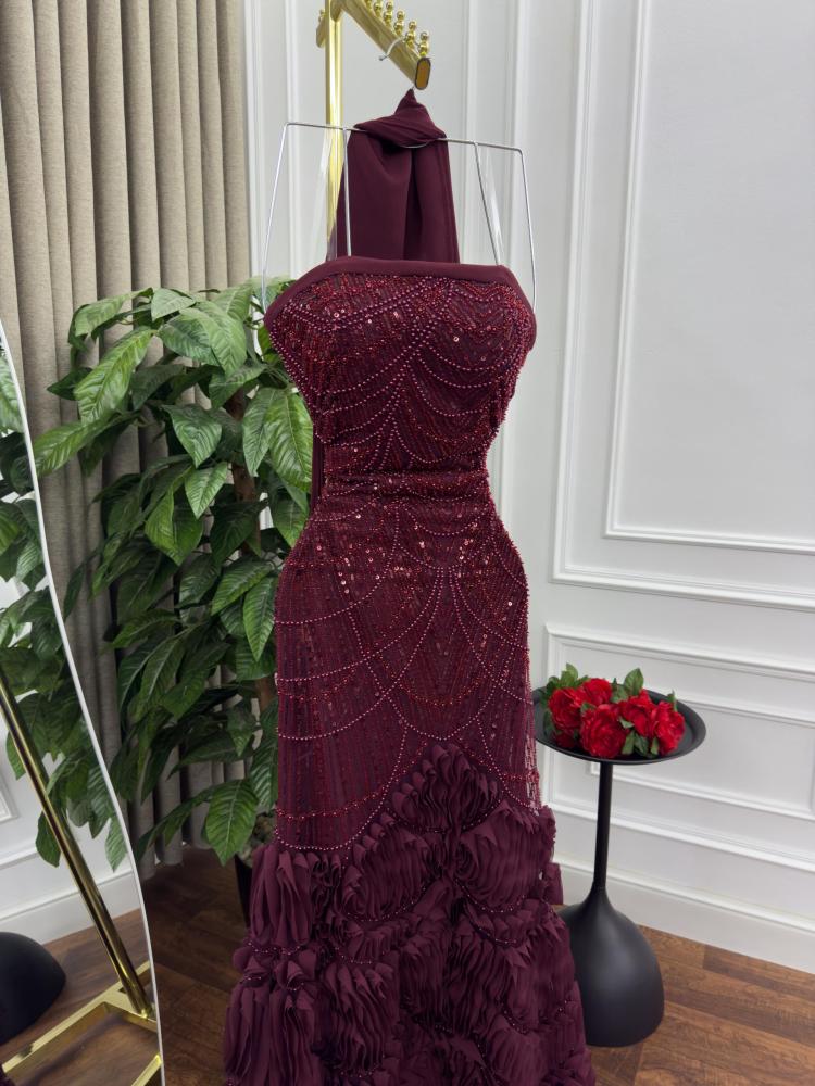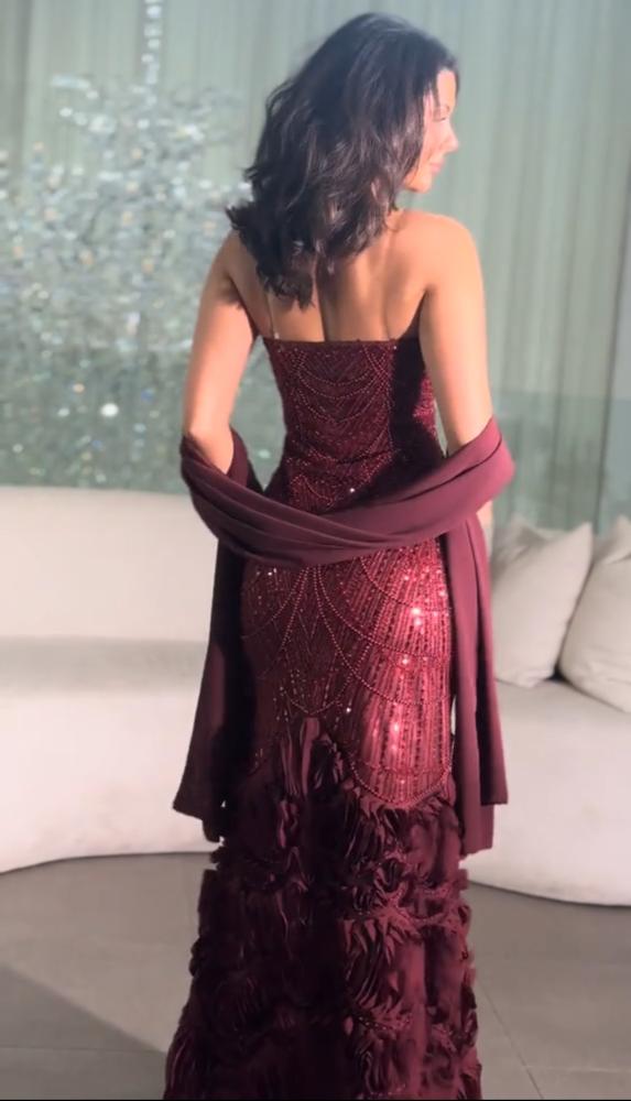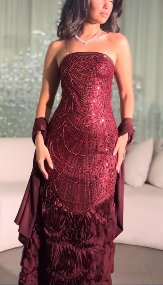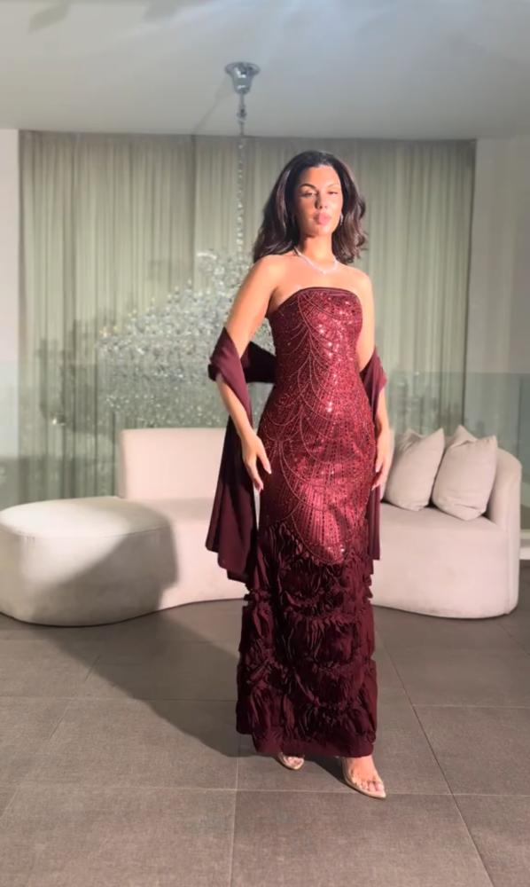 هذي الفستان بلون عنابي جذاب، مزين بتفاصيل براقة تضيف لمسة من الفخامة. القصة الضيقة تبرز جمال القوام، مع تصميم مميز يضيف لمسة من الأنوثة. القماش ناعم ومتدفق، مما يجعله مثالي للمناسبات الخاصة والحفلات. خيار رائع لمن تبحث عن إطلالة ساحرة ومتميزة.