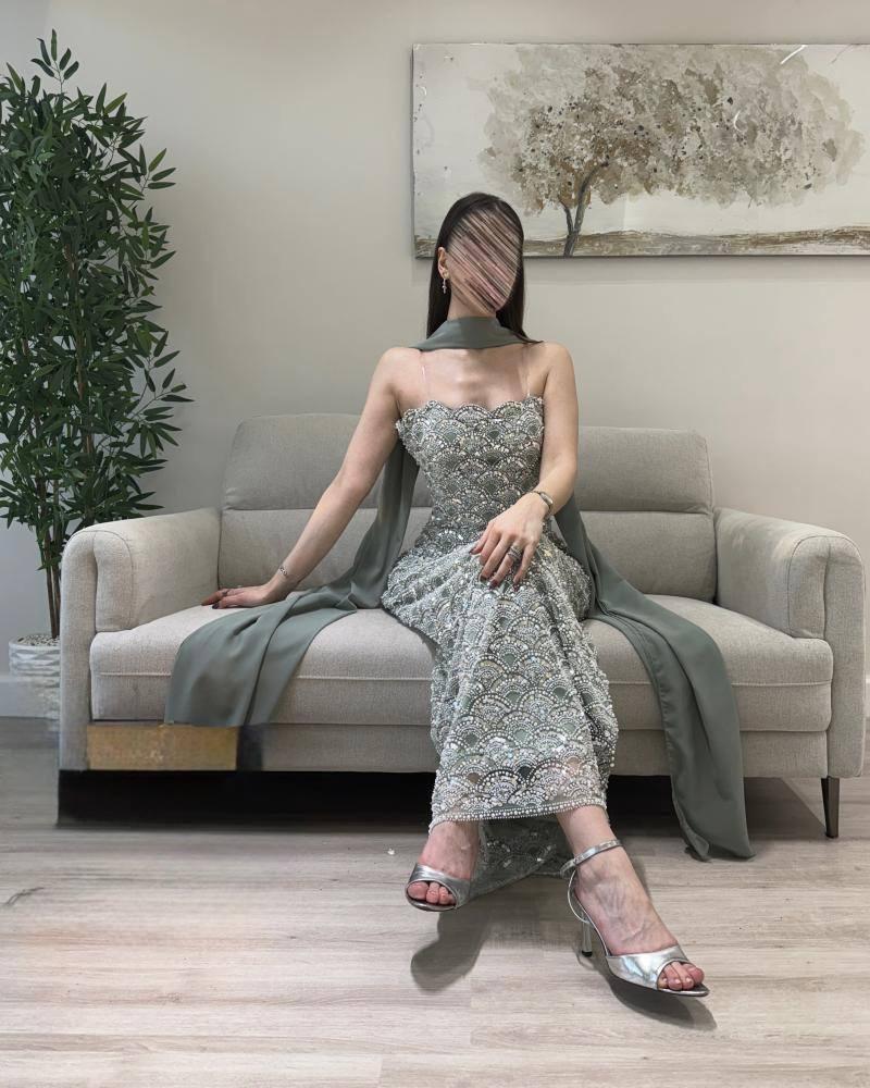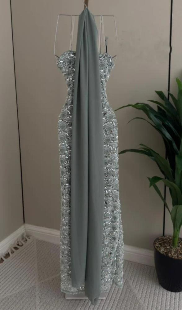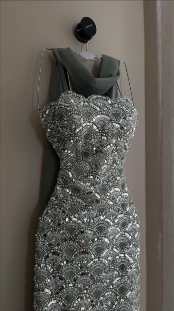 فستان فخم ، مطرزة بتفاصيل رماديه واخضر أنيقة تضيف لمسة فخامة وأنوثة، تصميمها ناعم وراقي يناسب كل المناسبات. 🌸✨